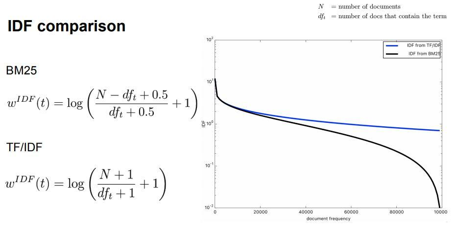 BM25에서는 TF-IDF와 다르게 IDF 에서의 영향력이 강해진다.
