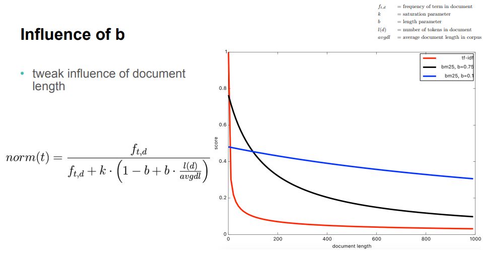 bm25의 검색 점수를 계산하는 수식은 위와 같은데, bm25에서는 각각의 파라메터들의 영향력이 어떻게 변화하는지 아래에서 확인할 수 있다.