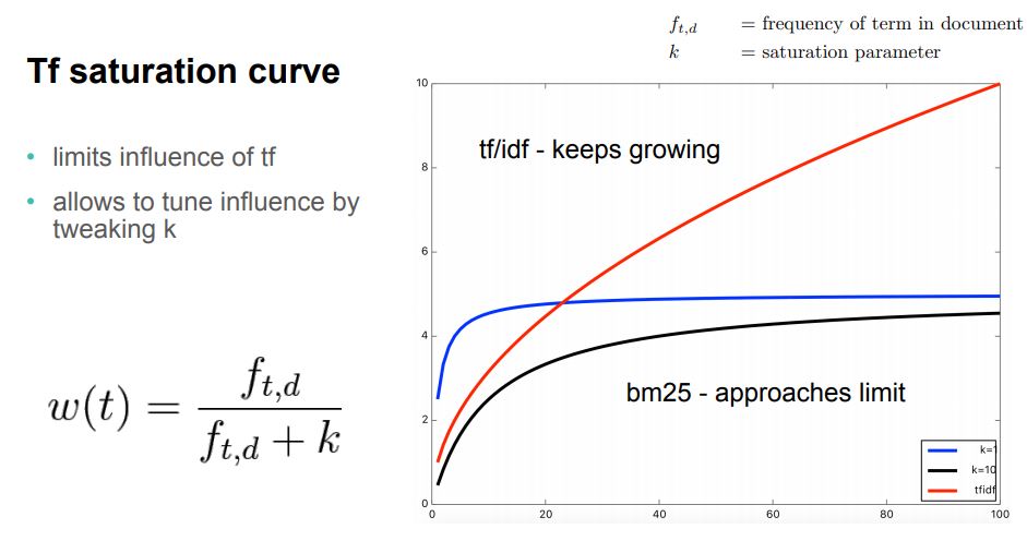TF-IDF에서는 단어 빈도(TF)가 높아 질 수록 검색 점수도 높아지는데, BM25에서는 특정 점수로 수렴한다.