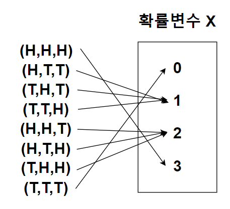 이 때, 앞면이 나오는 횟수를 X라고 하면, 다음과 같은 결과를 얻는다.