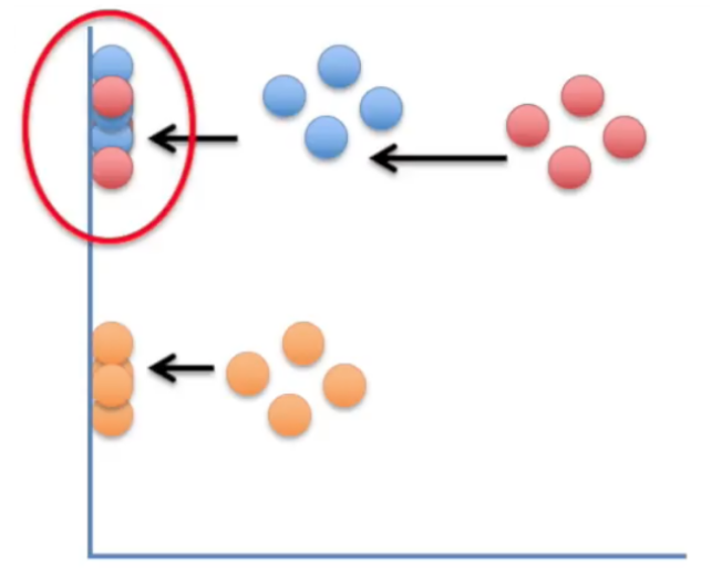 이 그림은 2차원에서 1차원으로 PCA 분석을 이용하여 차원을 줄인 예인데, 2차원에서는 파란색과 붉은색이 구별이 되는데, 1차원으로 줄면서 1차원상의 위치가 유사한 바람에, 두 군집의 변별력이 없어져 버렸다.