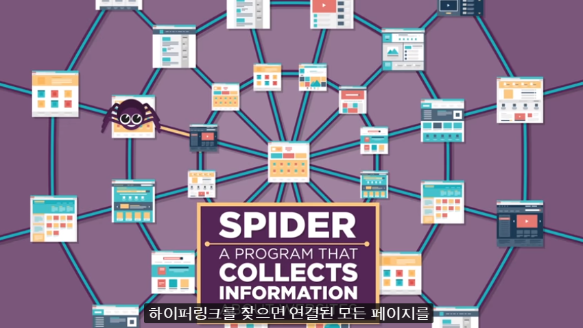 검색 엔진은 이 웹 페이지에서 정보를 수집하는 “스파이더(거미)”라고 불리우는 프로그램을 꾸준히 실행한다. 하이퍼링크를 찾으면 연결된 모든 페이지를 방문할때까지 따라갑니다.