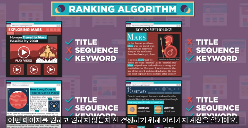 각 검색 엔진 마다 여러분이 원하는걸 생각해 페이지의 랭킹을 정하는 자체 알고리즘이 있다.