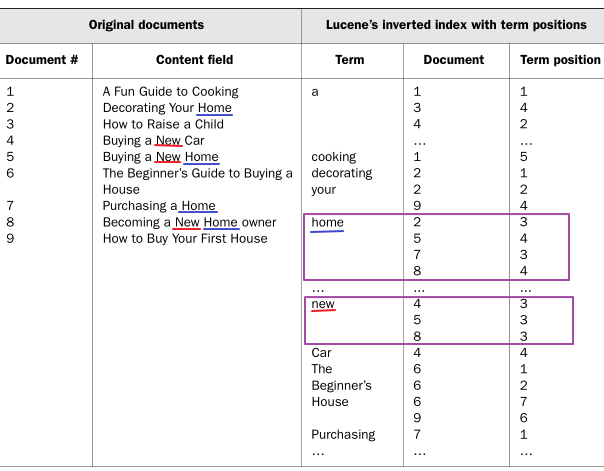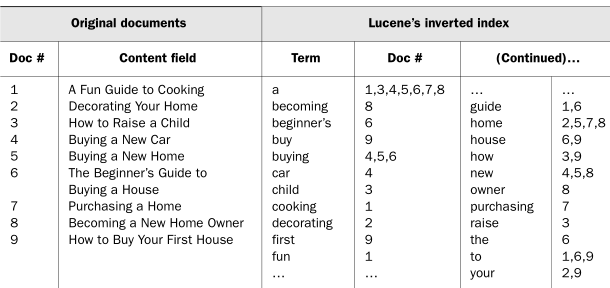 1~9 문서를 역색인한 결과가 오른쪽 Lucene's inverted index이다.