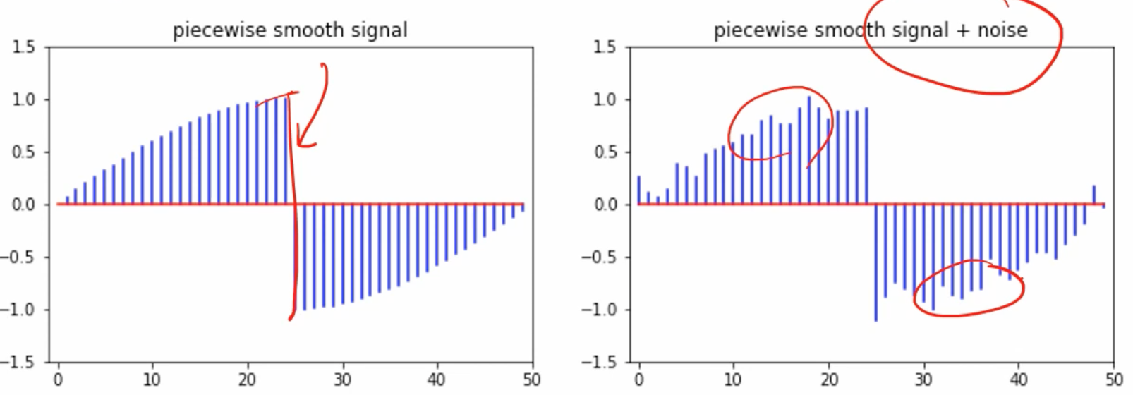 좌상단과 같은 신호가 있었다고 할 때, 노이즈를 주면....(우상단) 들쭉날쭉하다.