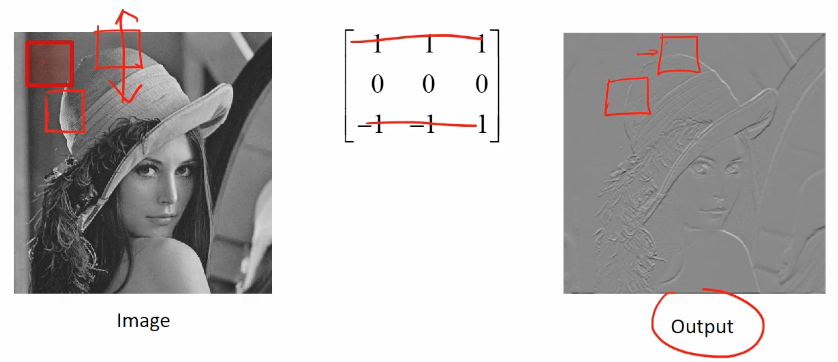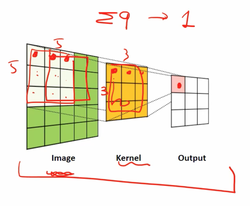 3x3커널과 콘볼루션하면 9개값이 나오는데, 이를 모두 더하면(summation) 결과값이 나온다.