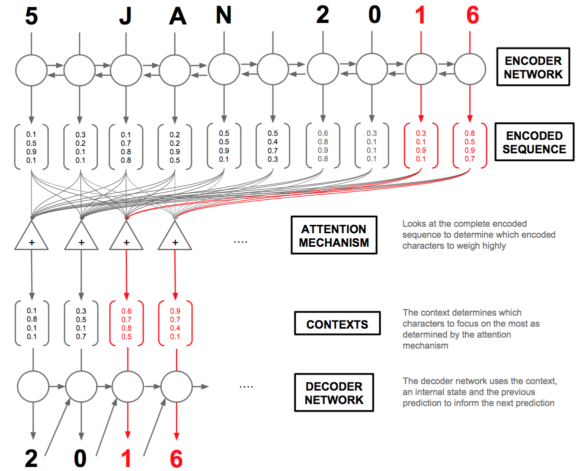 빨간색 화살표는 어텐션 메커니즘이 출력문자 "1" 과 "6"을 생성할 때